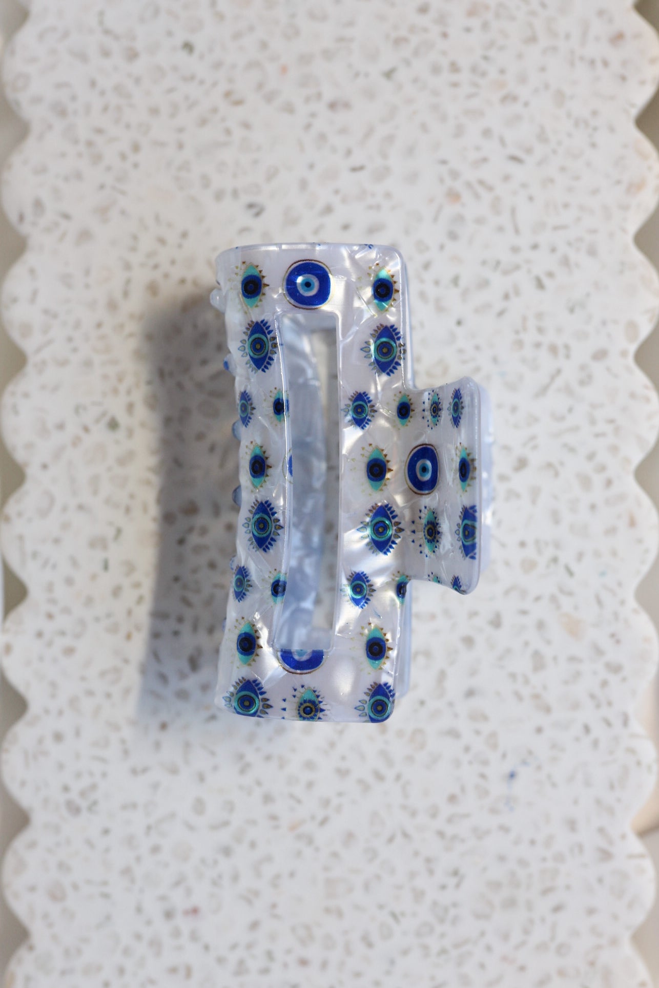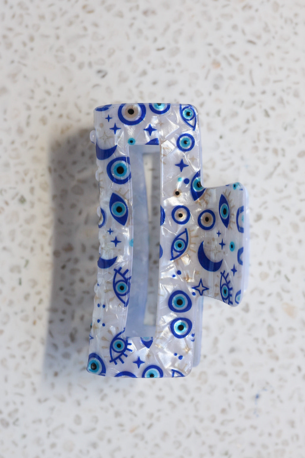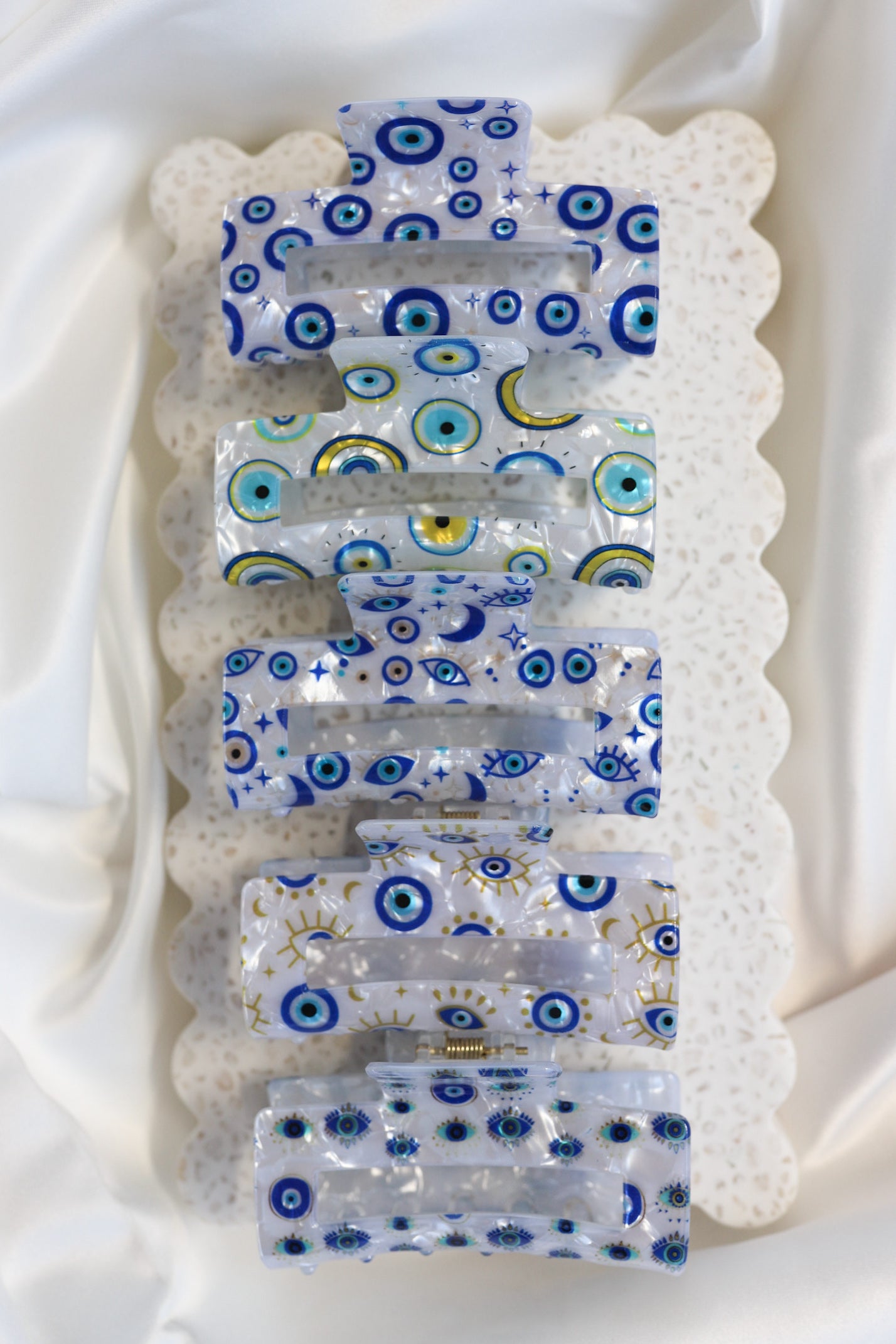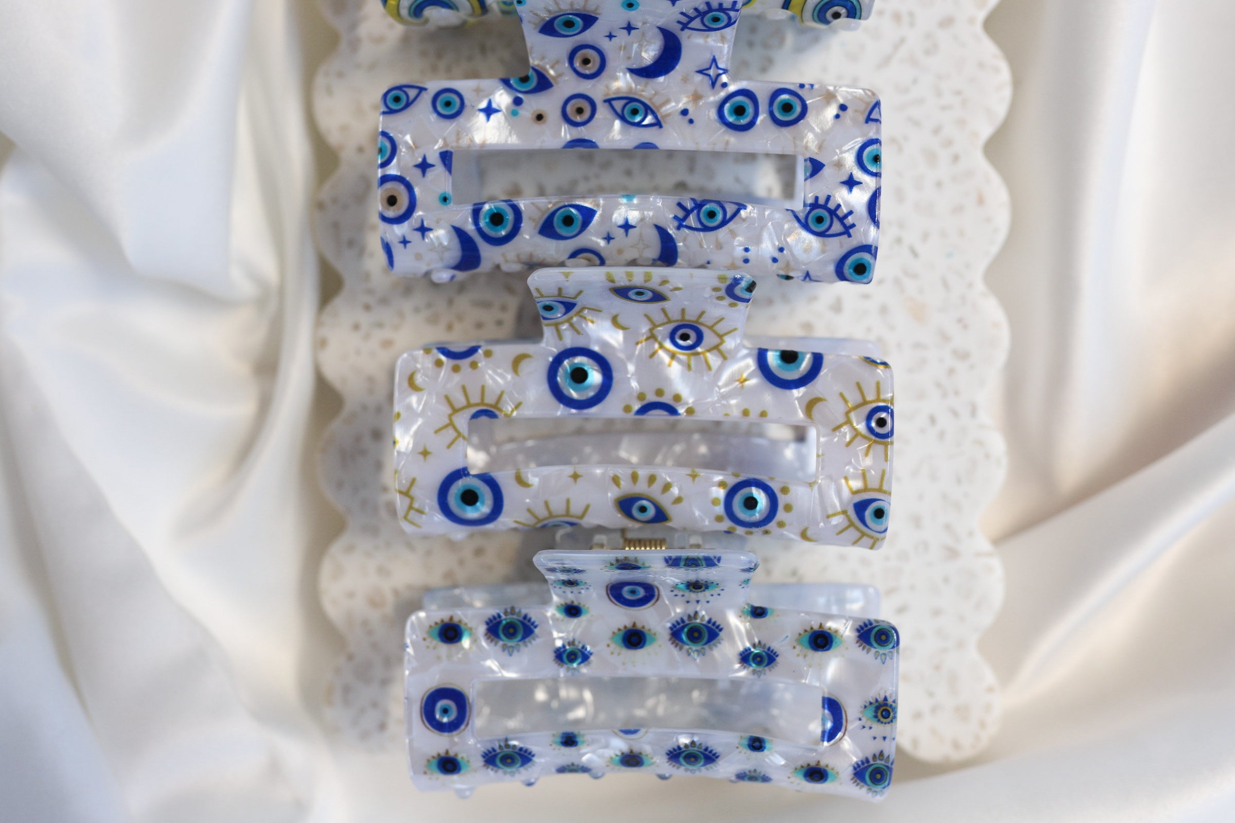 Our Evil Eye Claw Clips are designed to hold your hair securely while offering a touch of protection and to your everyday up do. Each piece features the evil eye, believed to ward off negative energy and attract calm, balanced energy throughout your day. Crafted from durable acrylic with a smooth, glossy finish.