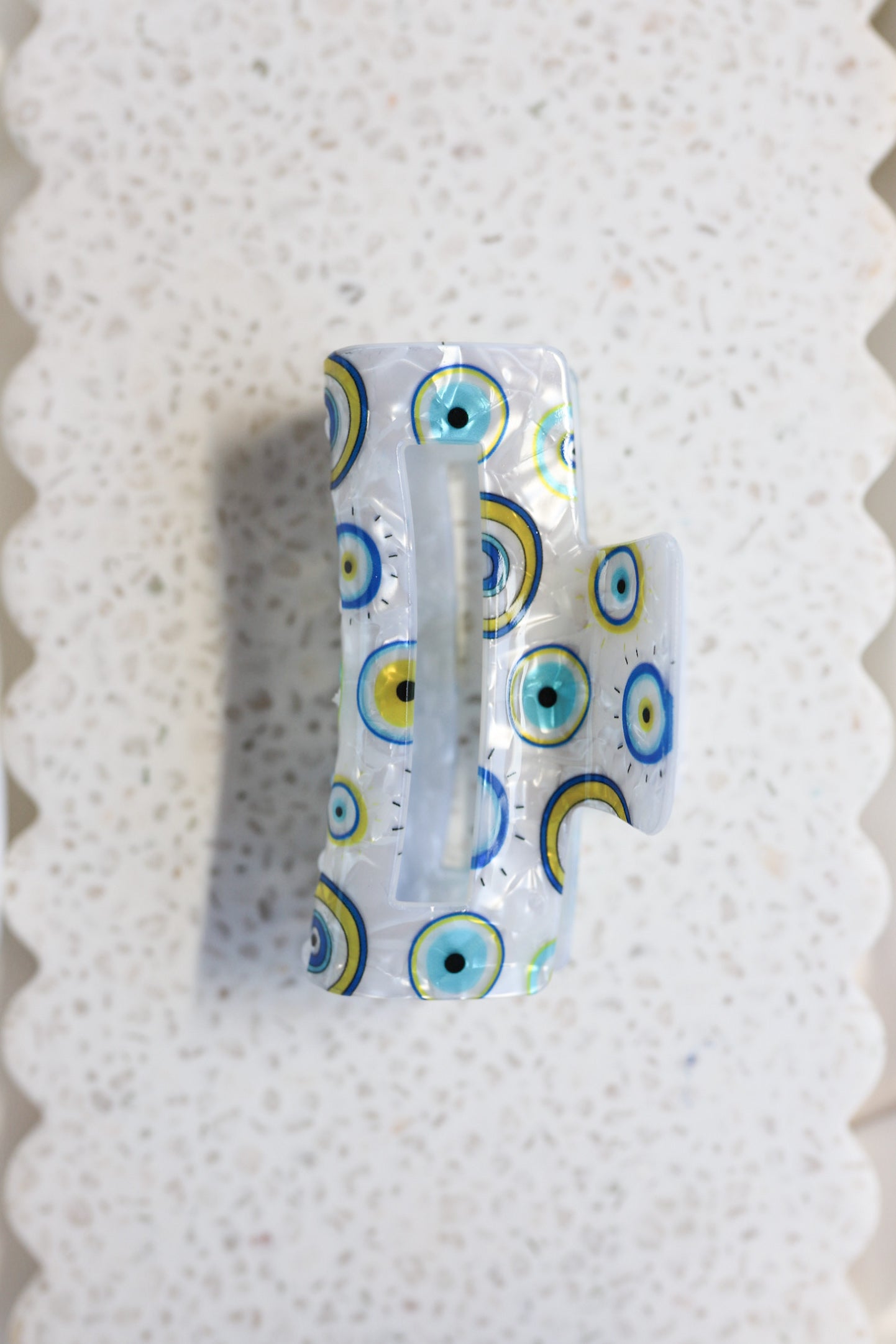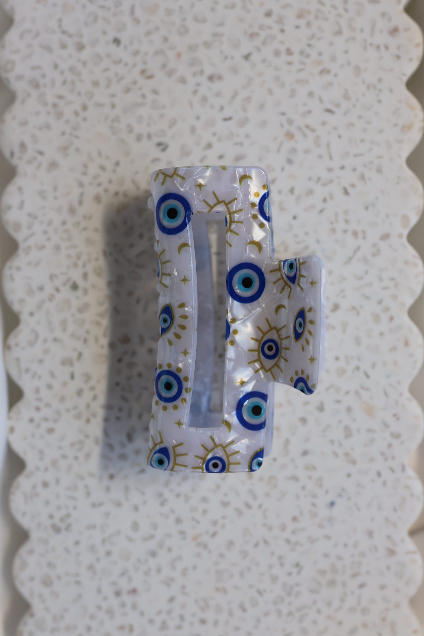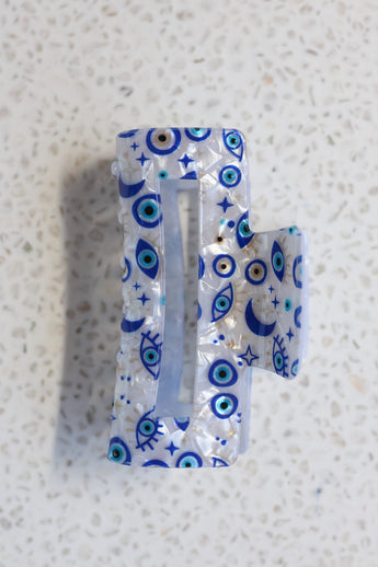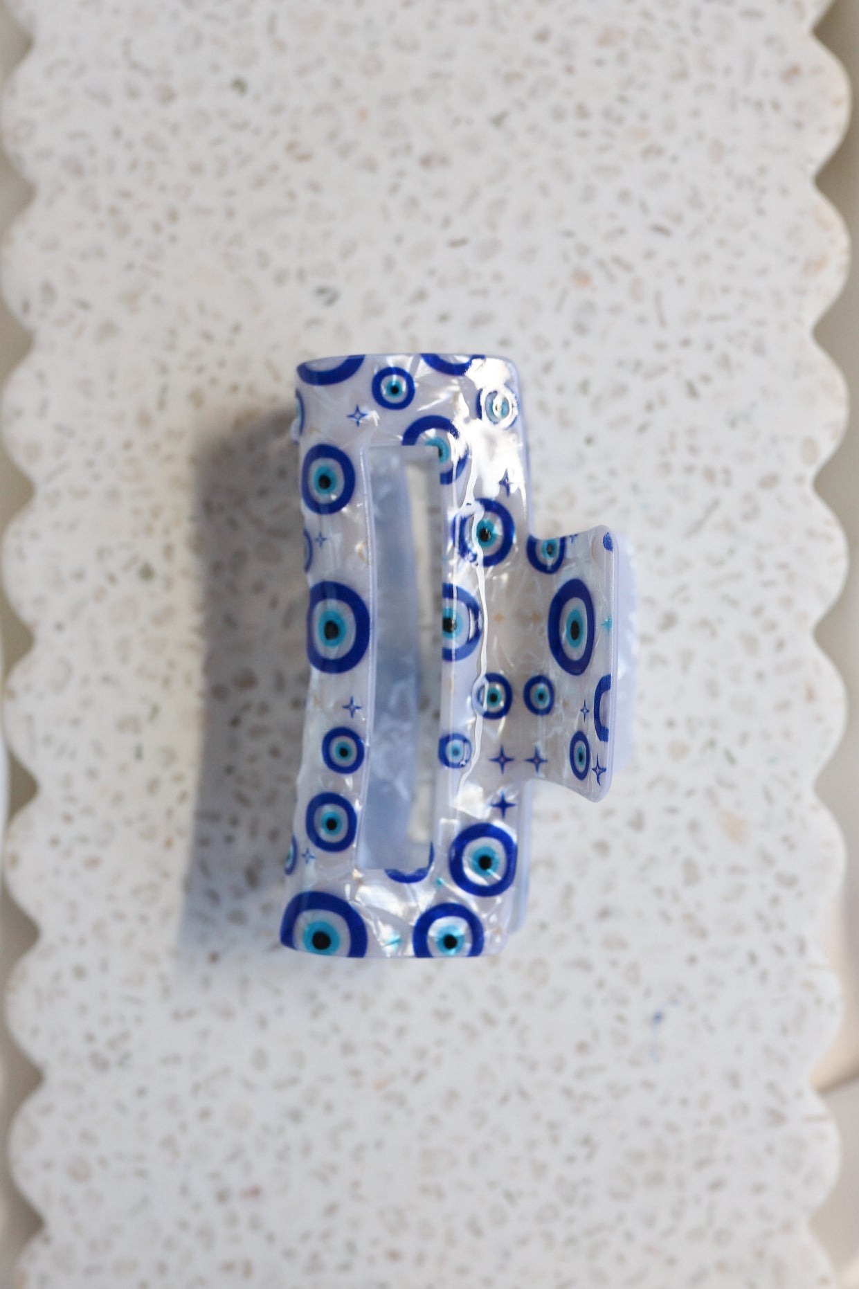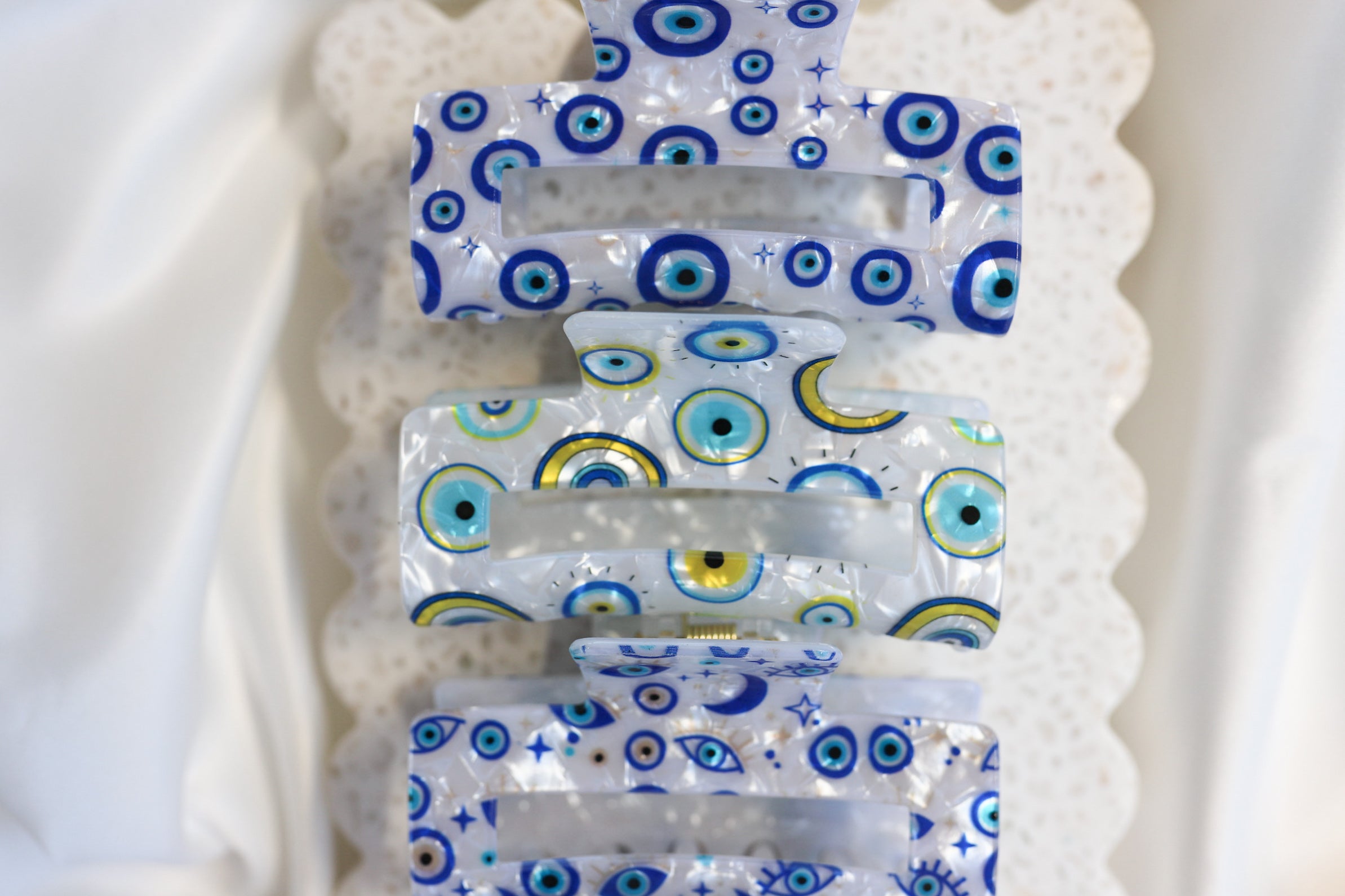 Our Evil Eye Claw Clips are designed to hold your hair securely while offering a touch of protection and to your everyday up do. Each piece features the evil eye, believed to ward off negative energy and attract calm, balanced energy throughout your day. Crafted from durable acrylic with a smooth, glossy finish.