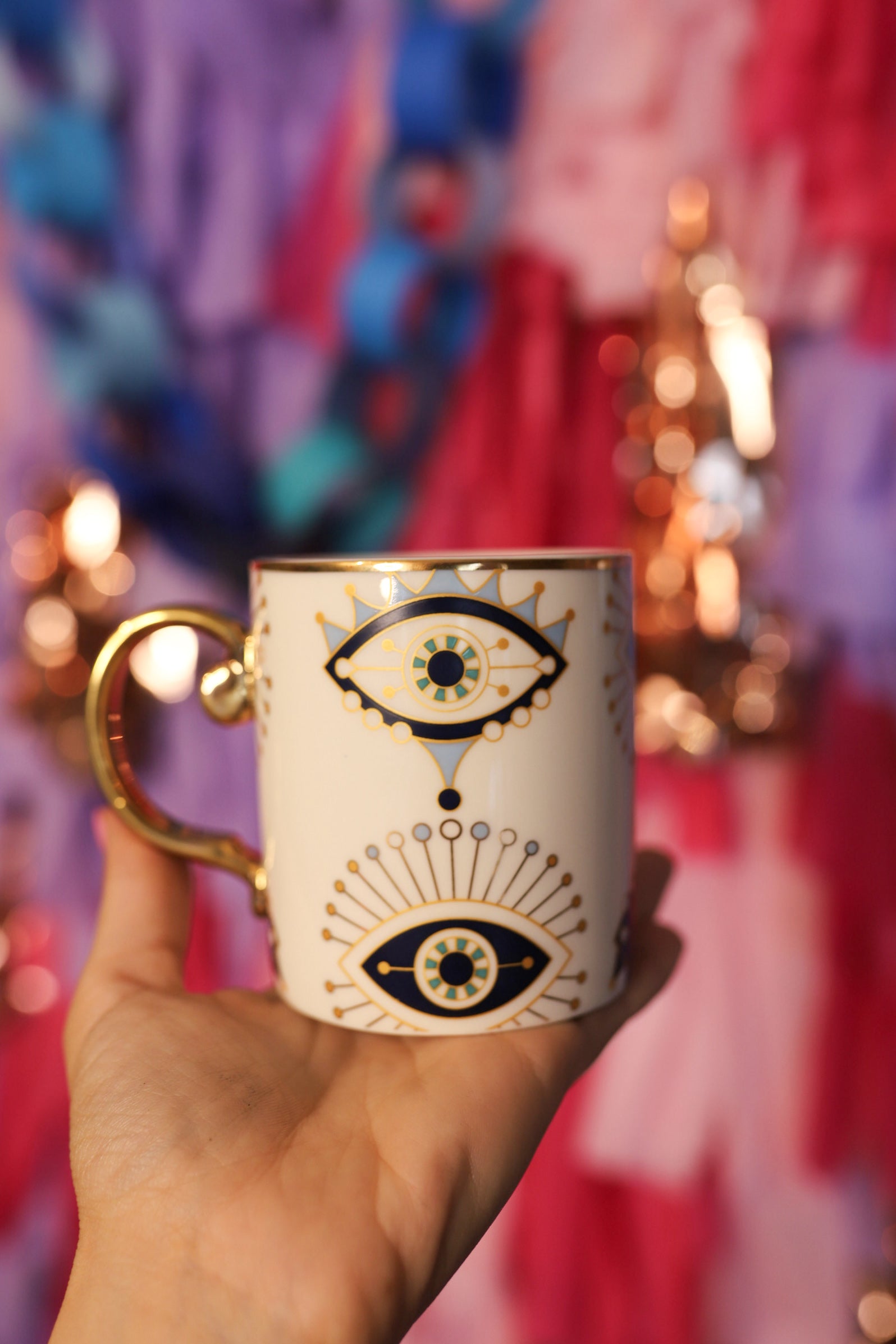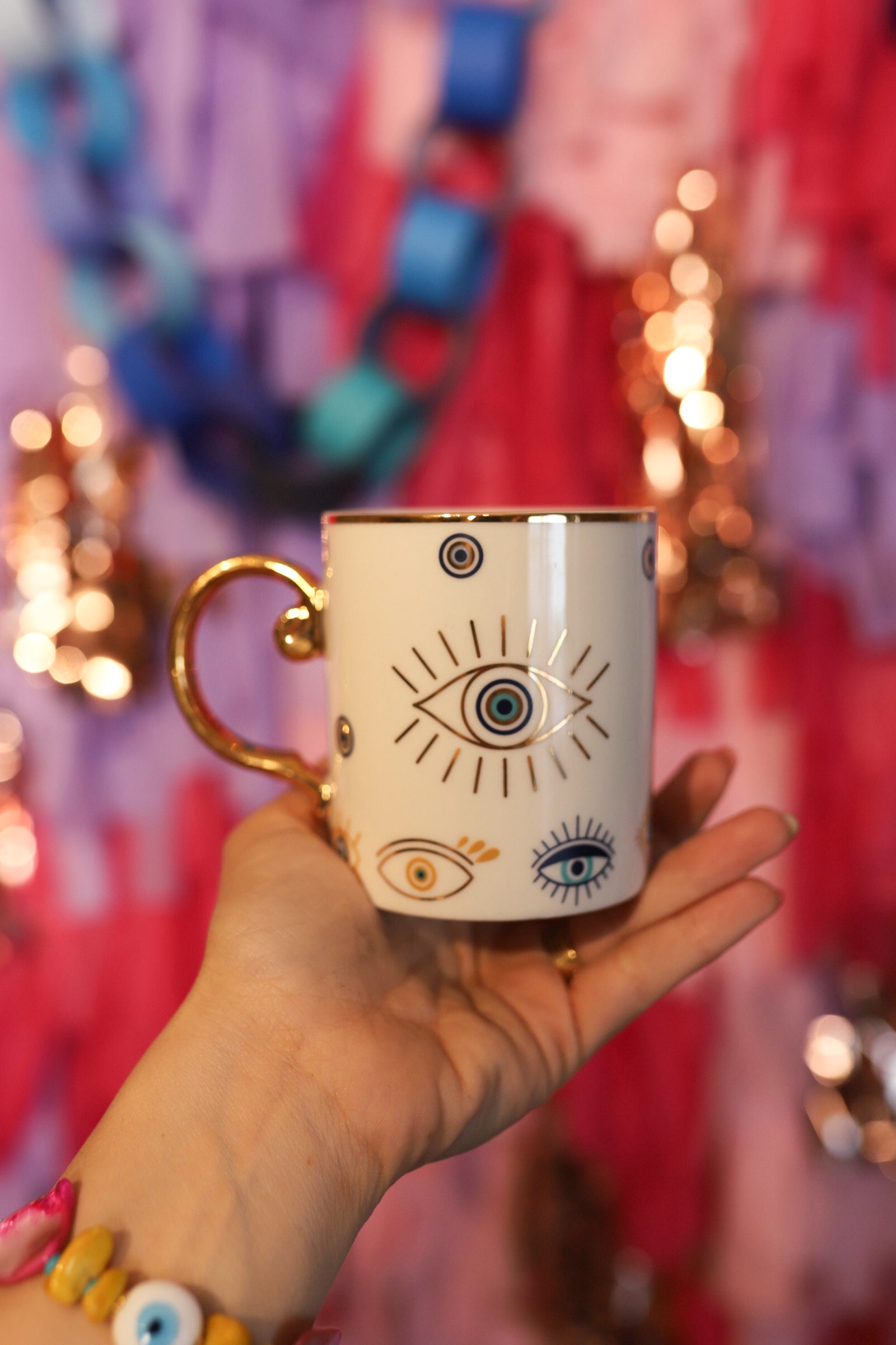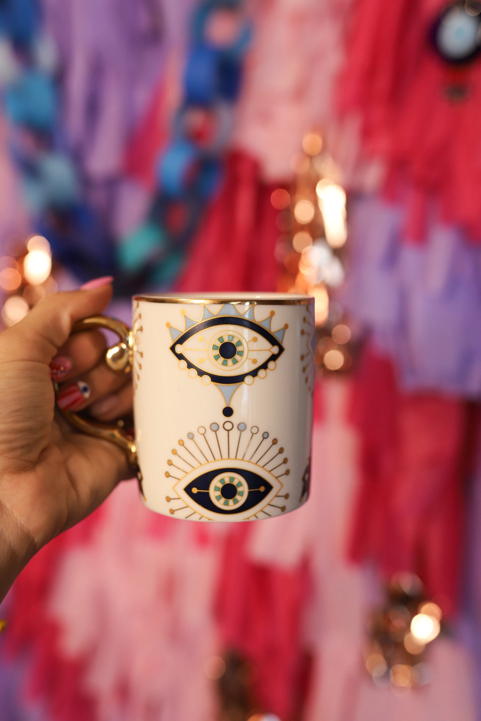 Start your morning protected and aligned with our Evil Eye Coffee Mug, designed to bring calm and intention to your daily ritual. Each mug features delicate gold foiling along the handle and across the protective evil eyes. Perfect for your morning coffee or tea, she's a reminder to begin each day surrounded with positive thoughts and good energy.