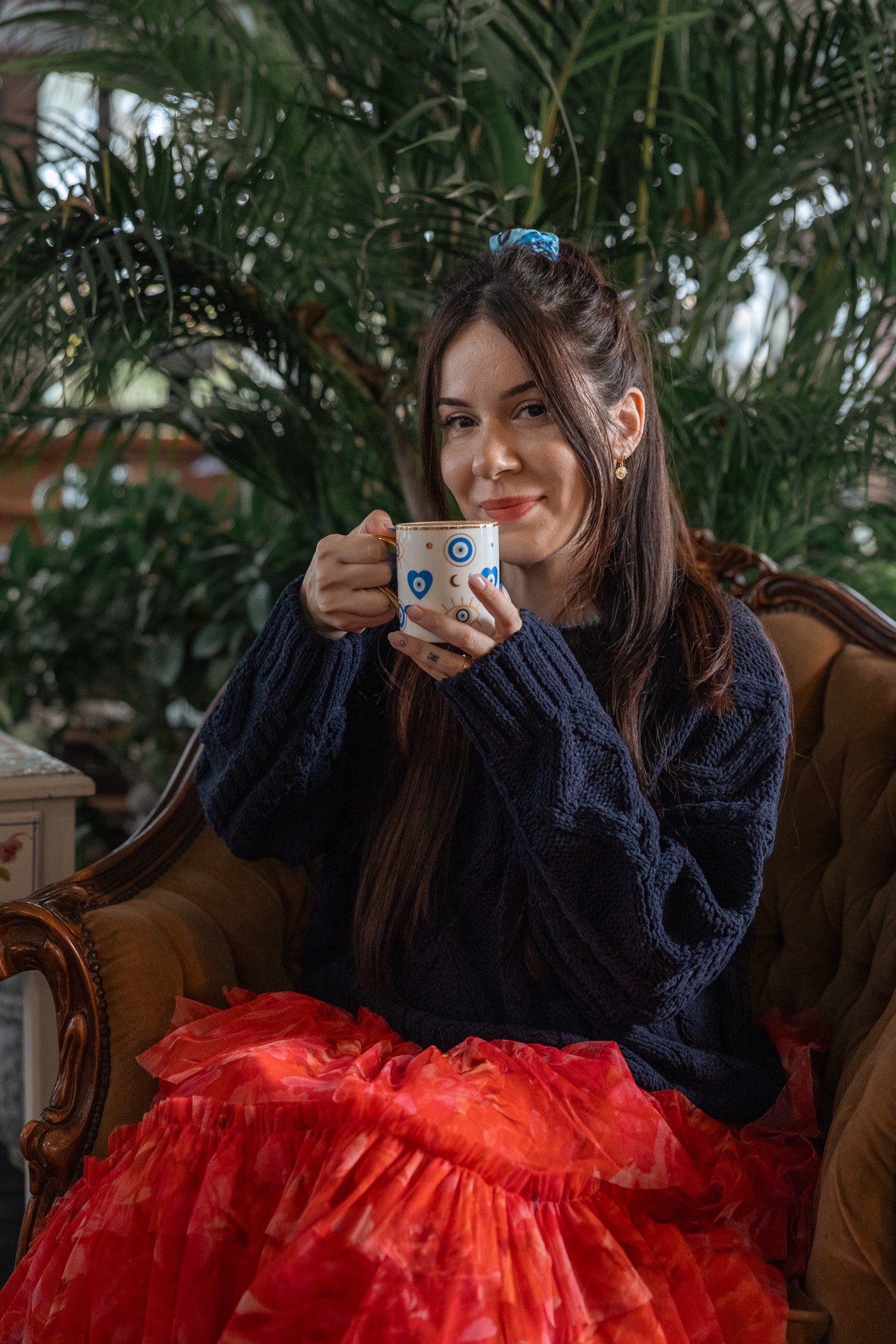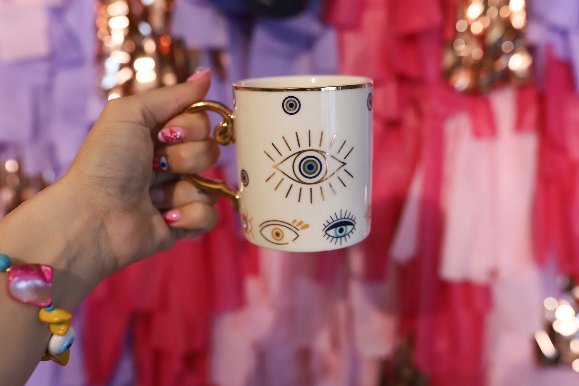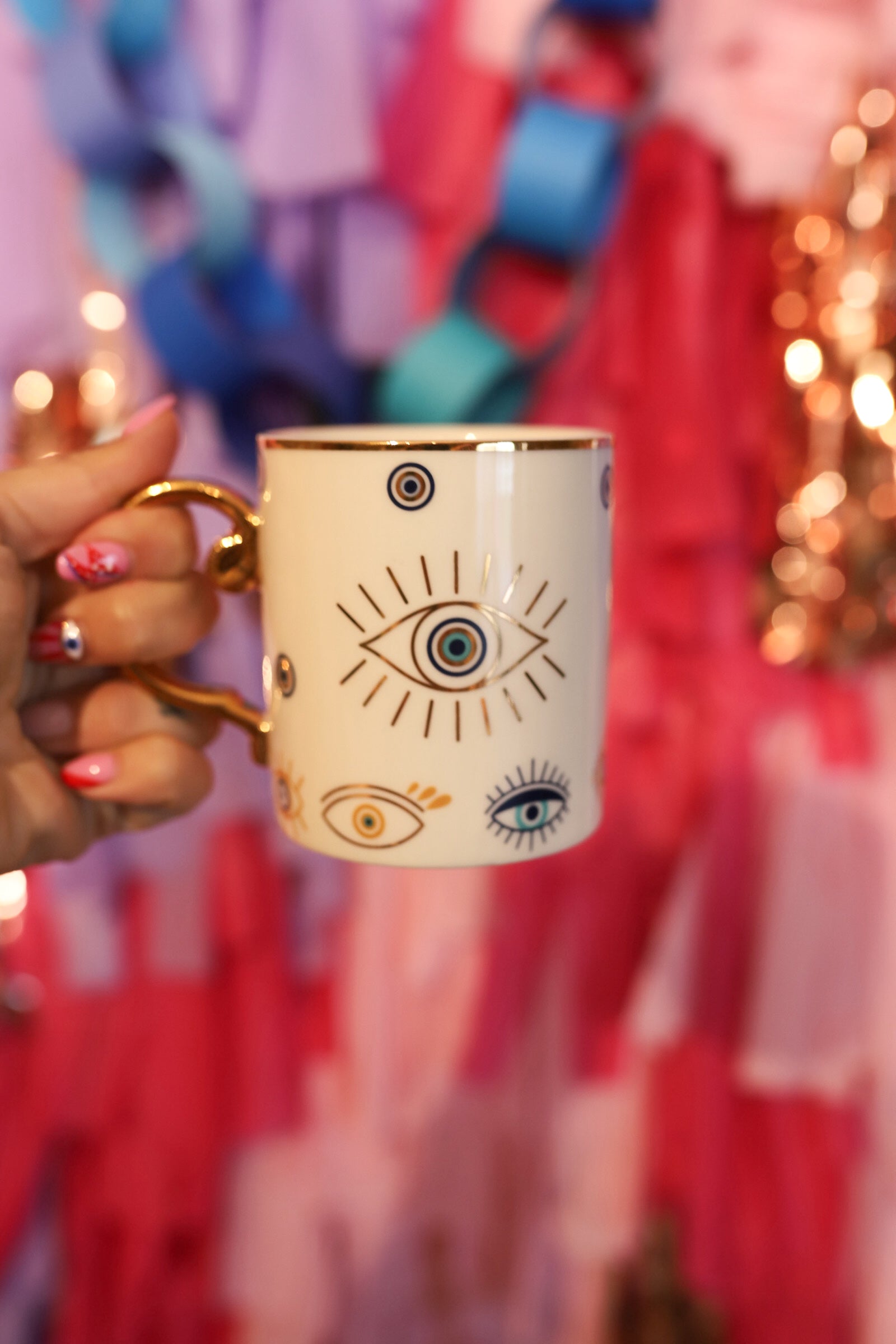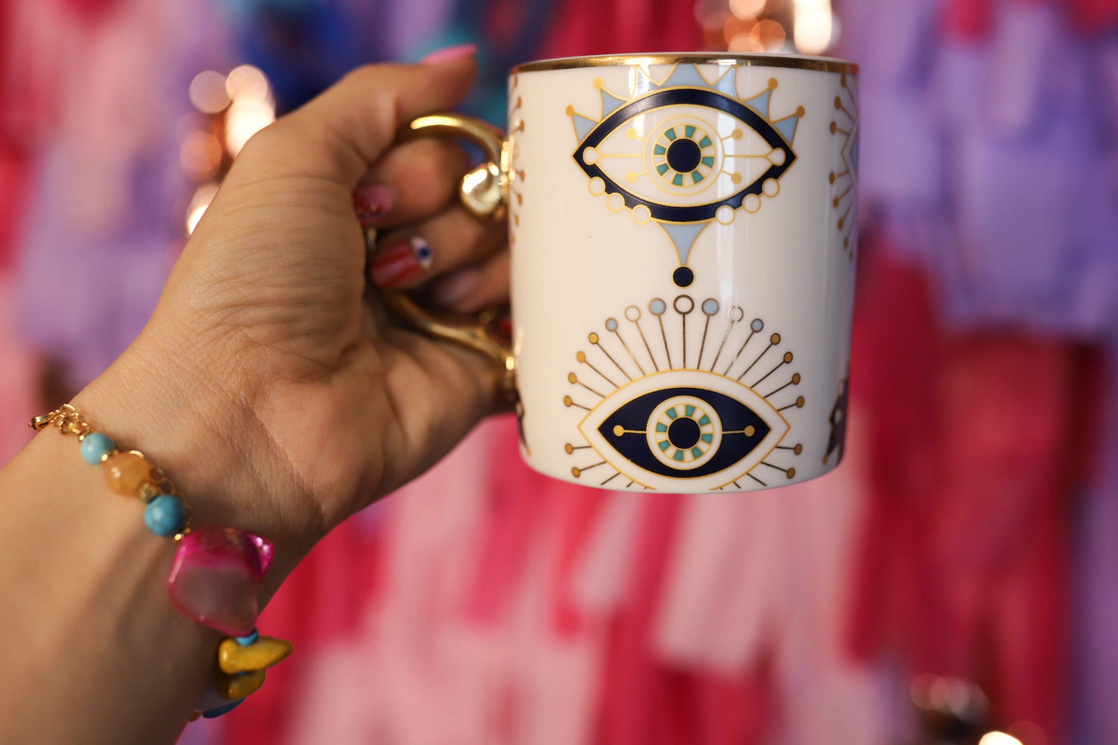 Start your morning protected and aligned with our Evil Eye Coffee Mug, designed to bring calm and intention to your daily ritual. Each mug features delicate gold foiling along the handle and across the protective evil eyes. Perfect for your morning coffee or tea, she's a reminder to begin each day surrounded with positive thoughts and good energy.